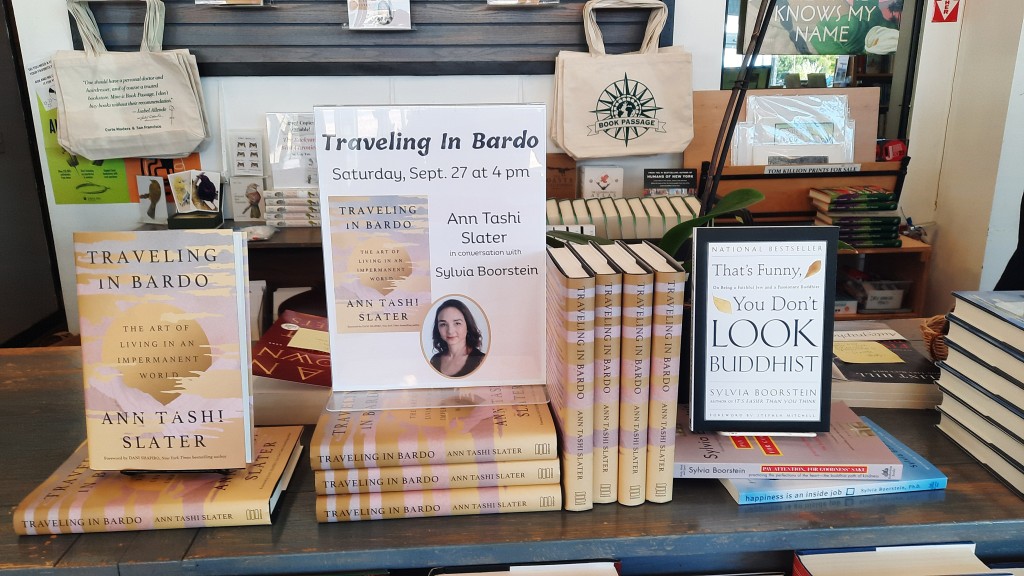 Ann Tashi Slater's poignant memoir TRAVELING IN BARDO: The Art of Living in an Impermanent World. Ann Tashi Slater in conversation with Sylvia Boorstein - photo by LeYung